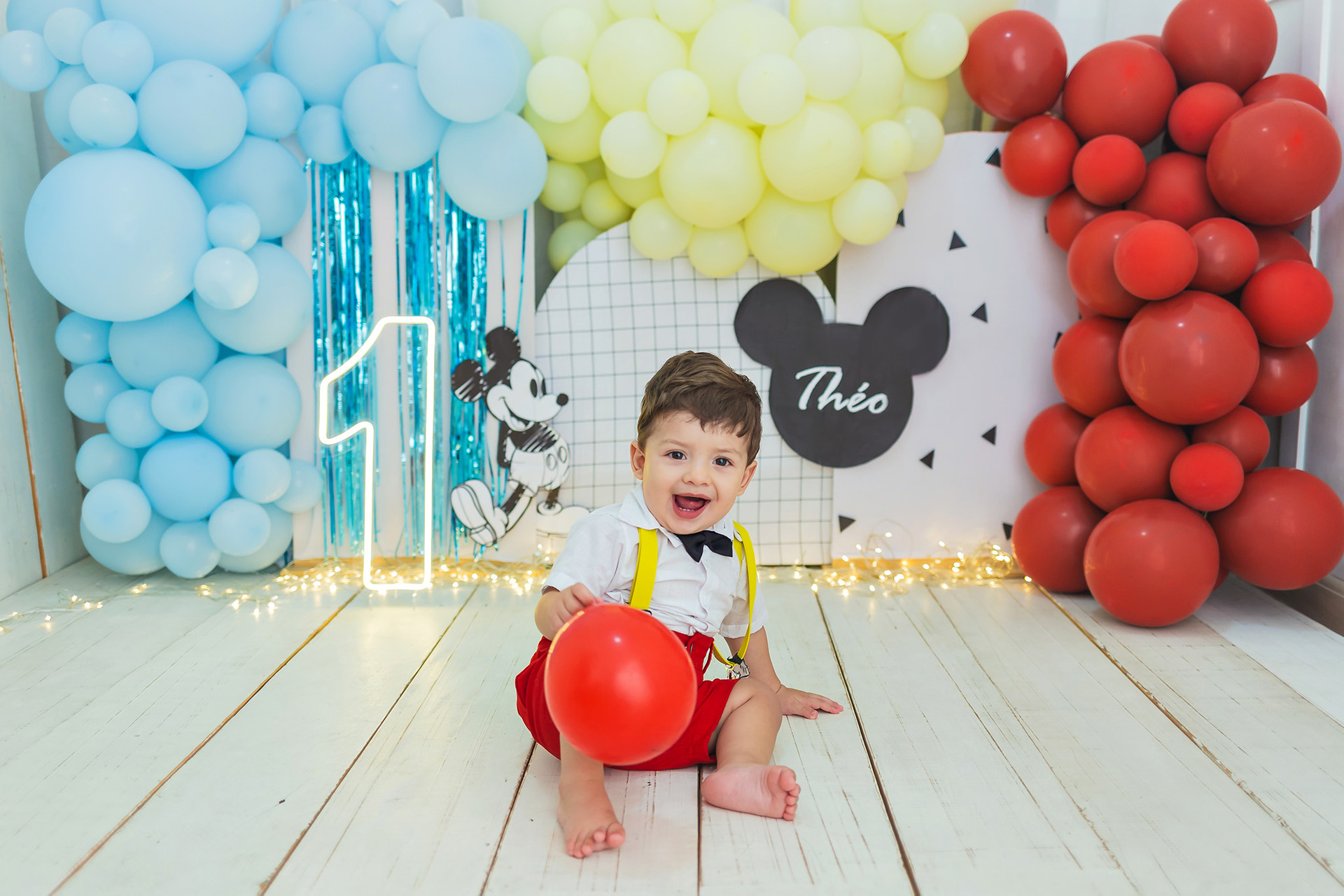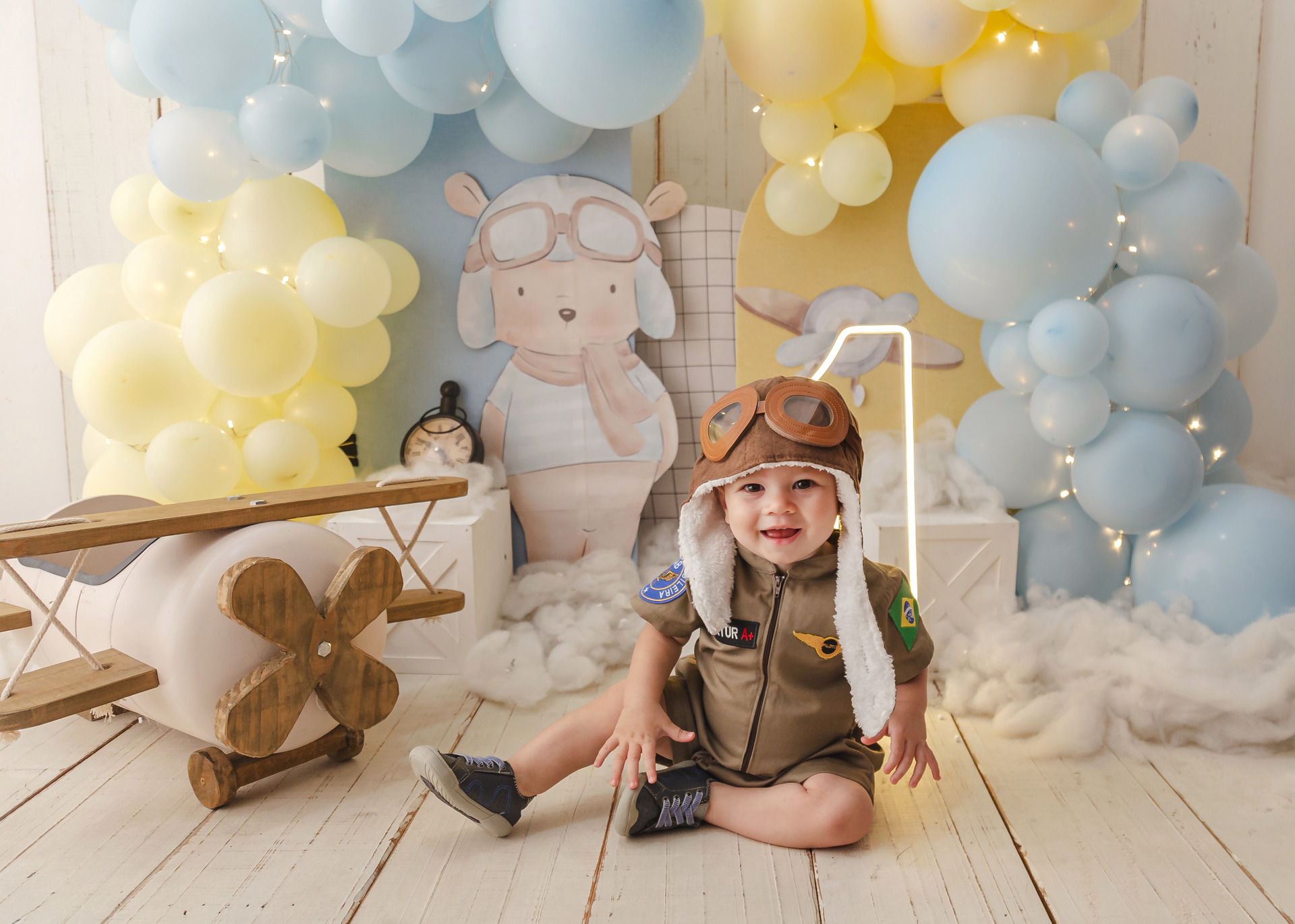 Antes da lambança com o bolo, é feita ma mini sessão com a roupa da criança (não fornecemos esse figurino, geralmente é usada a roupa da festa).